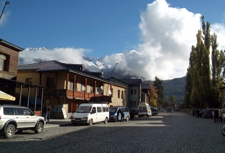 На обратном пути в маршрутке услышали историю, охарактеризовавшую ситуацию вполне – магазин 7/24 круглосуточный 7 дней в неделю – все время закрыт, рядом с ним расположен пункт обмена валют и надпись – «я в магазине». Вот очень много где так. Поэтому мы остались без сувенирных бутылок вина. В субботу кое как нашли, где можно хорошо поесть – кафе Ушба при хостеле Ушба. Не будь это кафе привязано к хостелу, оно бы, наверное, тоже не работало. Здесь, впервые за всю поездку на просьбу завернуть с собой недоеденное, еду не упаковали в контейнер, как обычно везде было, а просто выдали один желтый целлофановый пакетик. Кстати, если слова «упаковать» и «завернуть» не понимают, надо говорить «целлофан». Знание этого волшебного слова спасло меня в маршрутке, или маршрутку от меня.