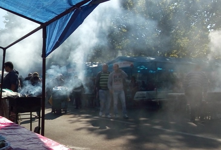 Гуляя по Тбилиси в первый день прибытия в город после двух недель разъездов по разным уголкам Грузии, наша компания несколько ошалела от пробок, светофоров и толпы. Мы шли в сторону центра и не очень понимали, что происходит. С площади валил дым, и когда при приближении оказалось, что это тысячи мангалов, стоящих на площади среди шума и кутерьмы, на которых жарится мясо – прозвучала меткая шутка про «филиал ада».
