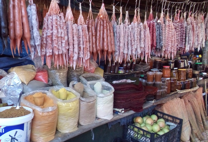 Зелень, орехи, разнообразие злаковых и масла из них, специи, красивая чурчхела, блестящая на солнце своими аппетитными боками.