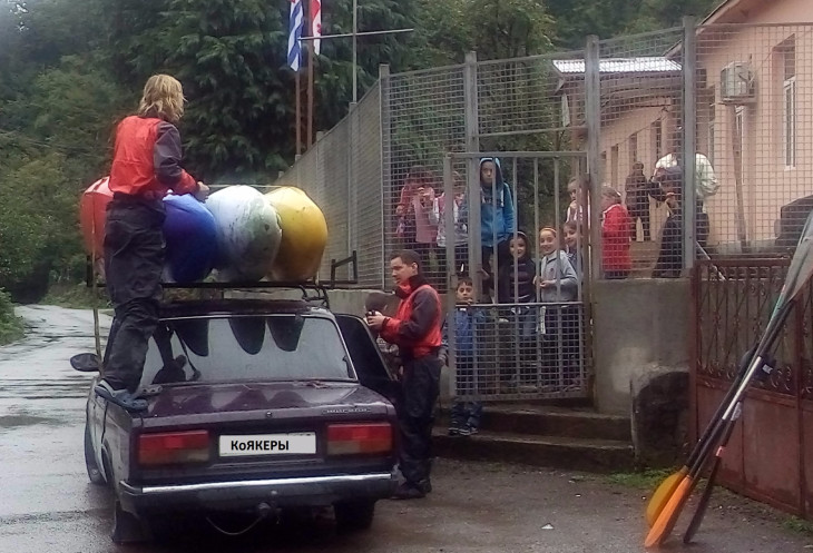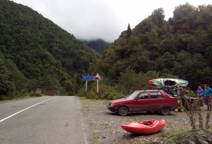 Качество дорог в Грузии достаточно хорошее, местами. А местами – это катастрофа. В основном это в местах производства ремонта или в горах, где есть селевые выкаты или ручьи. В целом хорошо. Ехать по горам достаточно тяжело, очень крутые серпантины, знаки «обвал» натуралистичны – скала под прямым углом и падающие сверху камни, и к великому ужасу, кое-где за знаком вполне реальное воплощение этой картинки, так что стоять в таких местах или прогуливаться по дороге не безопасно, да и проезжать как-то страшновато. Мы долго с удивлением смотрели на волшебные развязки типа «кольцо». В Грузии кольцо – это просто круг, нарисованный белой краской на перекрестке или площади любой конфигурации, в общем если не знать местности, ехать в темноте или в дождь, то легко кольцо не заметить. В отдаленных горных районах почти все водители приветствуют сигналом любого человека, а нашу необычную яркую компанию с разноцветными лодками - так особенно. Вообще, сложилось такое впечатление, что каждый уважающий себя грузин, проезжая мимо поселения, где у него есть родные или знакомые, обязательно «побибикает», а также по любому поводу – совершая обгон, или встретив коллегу (водитель маршрутки всегда посигналит другой маршрутке). От этого на дорогах совсем не скучно, даже несколько утомительно для непривычных вроде меня.