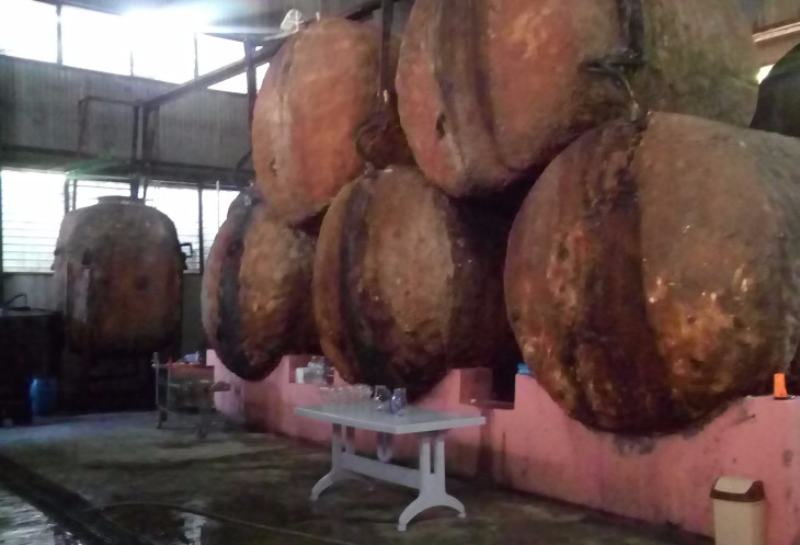 Я не помню, как назывался наш винный завод, он находился недалеко от города Амбролаури. Выше города по дороге мы забрались куда-то достаточно высоко в гору и оказались в милейшем месте, таком фермерском уголке, где извилистые грунтовые дороги позволяют свешивать над своей колеей ветви с яблоками, заборы искусно и очень живописно состарены самой природой, а под ними неспешно разгуливают куры и поросята. Тишина и вид в долину. Красота невероятной глубины. И вот здесь, на холме расположился ангар с ним, с прекрасным напитком, возрождающим все желания жизни, если они вдруг задремали. Из огромных ржавых снаружи цистерн в ведра наливают небольшие дегустационные порции.