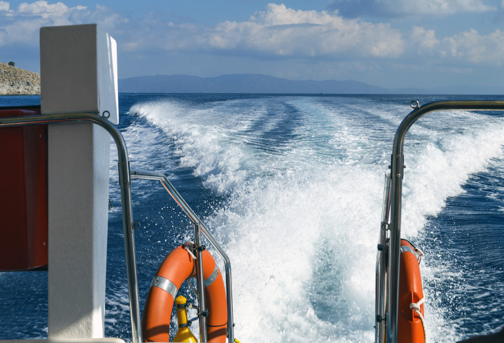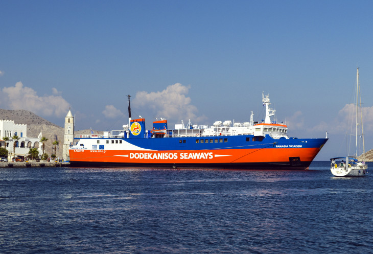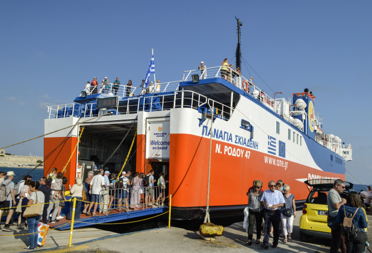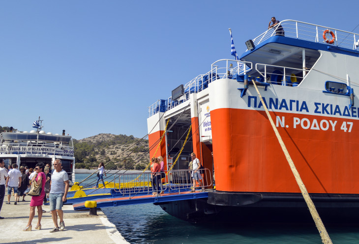 И вот ,наконец,настал тот день! )) Наш паром отходит в 9.30,поэтому к киоску на набережной мы подошли за полчаса,т.е. к 9.00.Оттуда трансферный автобус отвозит пассажиров на паром в коммерческий порт.(Кстати,обратно трансферный автобус тоже ждет и везет пассажиров до порта Мандраки бесплатно) Минут через 10-15 мы уже предъявляем билеты контролеру и поднимаемся на верхнюю палубу.