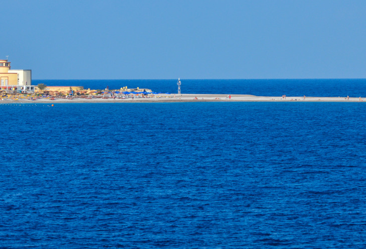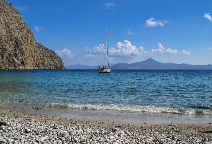 Пляж Агиос Георгиус полностью отрезан от цивилизации высокими отвесными скалами.Высота их достигает 300 метров,что делает бухту недоступной с берега.Поэтому и добраться сюда можно только на лодке.Место дикое, уединенное и очень красивое.Сам пляж галечный,местами каменистый.Но вода настолько прозрачная и чистая,что виден каждый камушек)) Скалы закрывают от ветра,поэтому в бухте тепло,вода тоже теплее,чем на Родосе.Так как пляж дикий,то никаких лежаков и кафе тут нет).