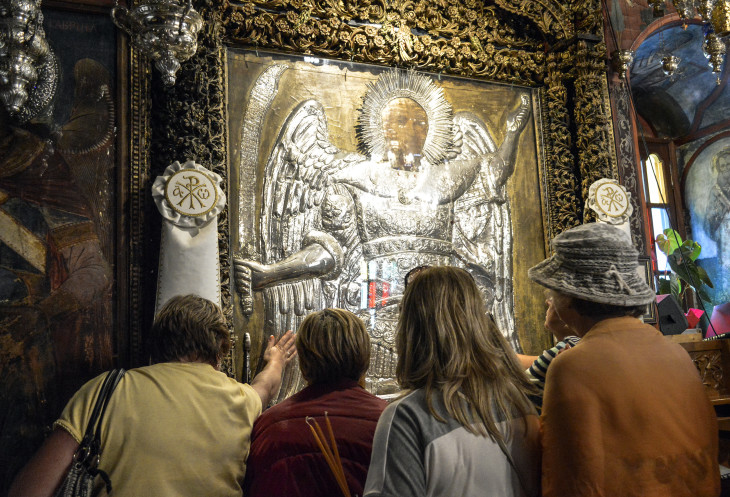 Вокруг иконы видны многочисленные приношения Архангелу Михаилу,а лампады, развешанные по всей церкви это благодарность людей за исцеления и чудодейственную помощь. В церковных книгах, которые хранятся в монастыре, зафиксированы тысячи случаев исцеления от разных болезней и недугов.(Правда,когда люди успевают молиться,прежде,чем что то попросить? Человеческий поток перед иконой движется не останавливаясь).