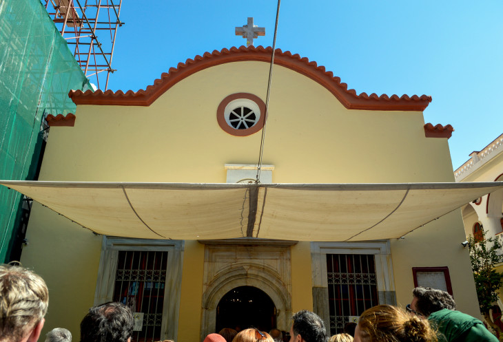 Церковь очень и очень красивая,но приехать сюда надо,когда никого нет.Наверно, лучше всего на автобусе из Ялоса с утра пораньше,пока не прибыл паром с туристами. Прикладываться мы не стали: у Архангела и без нас было много работы-запомнить все желания страждущих.))