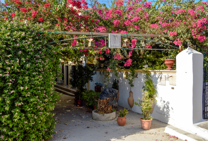 С высоты верхней палубы рассматриваем хозяев гостиниц, встречающих гостей .Среди них видим мужичка с табличкой наших апартаментов.Спускаемся и подходим к нему.После приветствий и знакомства,мужичок садится на мотоцикл и едет по набережной вперед,ловко лавируя между туристов,мы идем за ним.Минут через 10-15 доходим до нашего пристанища .Небольшой ,двухэтажный домик в неоклассическом стиле (как и все дома на Сими),дворик увитый цветами-это и есть НАШ ДОМ,ГДЕ МЫ БУДЕМ ЖИТЬ ЦЕЛУЮ НОЧЬ!!! (помните рекламу? "Приезжайте пожить,пусть и на одну ночь..."))