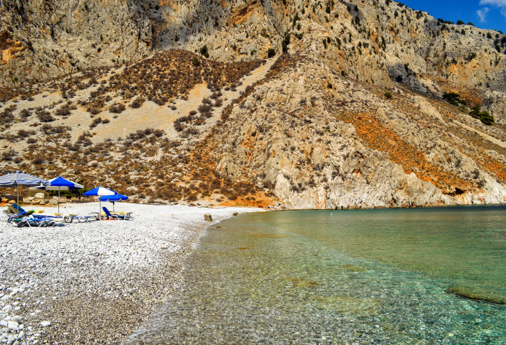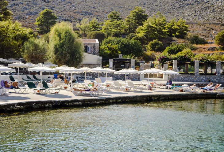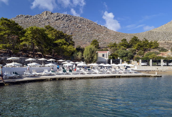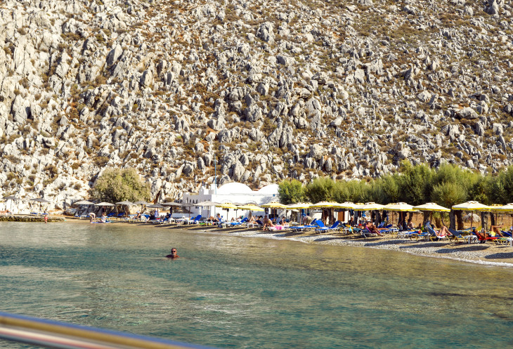Здесь высаживаются все отдыхающие.А лодки встают у скал,в ожидании обратного времени.Потом также,по очереди отвезут всех обратно в Ялос.Пляж довольно длинный,метров 200.Также белая галька,камушки,а местами и валуны)) Но это все не мешает,если надеть специальные тапки.Мы ходили и купались в таких,поэтому было вполне комфортно.На берегу расставлены лежаки,много свободных.Можно было занимать бесплатно.