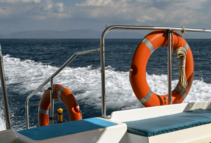 В лодку садится много пассажиров.Сначала заезжаем в бухту на пляж Агия Марина,несколько человек сходит там.