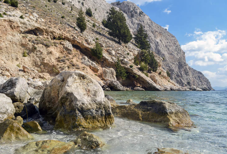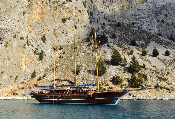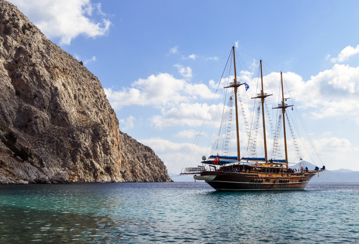 В бухте у скал с одной стороны стоял не большой катамаран,а с другой турецкий кораблик.