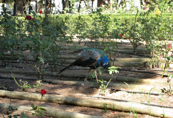 В этом парке, как на птицеферме, совершенно свободно разгуливают куры, петухи и павлины.