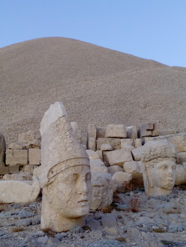 Историческая справка (Википедия): «в 62 г. до н. э., царь Коммагены Антиох I Теос из армянской династии Ервандидов построил на вершине горы Немрут гробницу — святилище, окруженную огромными статуями 8 — 9 метров высотой. Центр гробницы — курган из мелких камней, на вершине горы, высотой 49,8 метров и шириной у основания 150 метров. Под курганом находится гроб Антиоха I Коммагенского (69—38 до н. э.). Края скалистой вершины, на которой находится гробница, с трёх сторон превращены в большие террасы. Две из них украшены пятью величественными сидячими статуями высотой 8 метров: посреди находится фигура Зевса, по сторонам олицетворенная «Коммагена» и царь Антиох, по краям Аполлон и Геркулес. В 1987 году археологические памятники на вершине горы включены в список Всемирного наследия ЮНЕСКО».