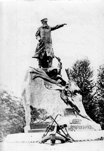 Перед фасадом того, что осталось от Итальянского дворца памятник П.К. Пахтусову (1800-1835).
