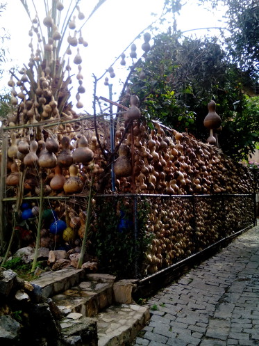 или найти вот такой забавный дом, точнее забор с тыквами. Здесь живет мастер, который делает всякие миленькие поделки из высушенных тыкв. Правда похожи на наши русские матрешки?