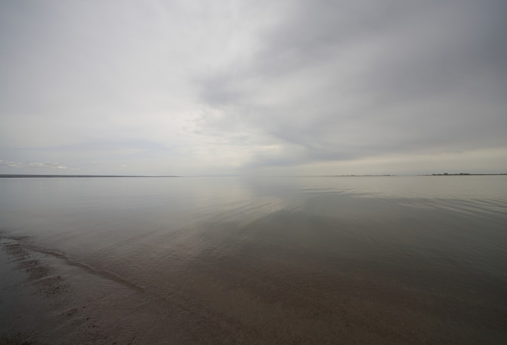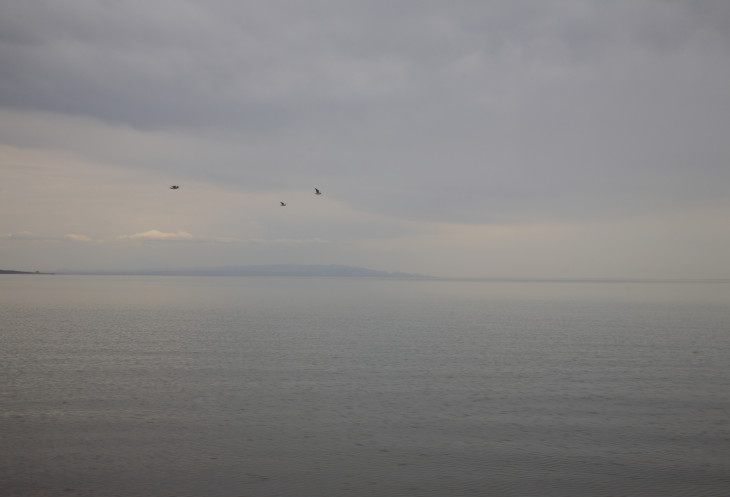 Мы приехали на широкий песчаный пляж, да вот только погода все-таки испортилась – облака висят над озером и прячут все горы над ним.