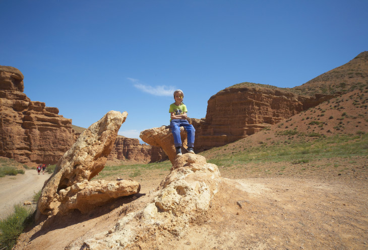 Недолго играем на берегу реки и идем обратно по дороге – общая длина каньона два километра. Обратно идем уже почти не останавливаясь: и от жары устали, и времени уже много. Если захотите поехать в Чарынский каньон, то постарайтесь приехать пораньше – и не так жарко будет, и народу поменьше. А то в этот жаркий майский день туристов здесь было просто очень много.