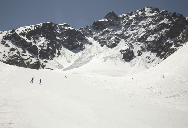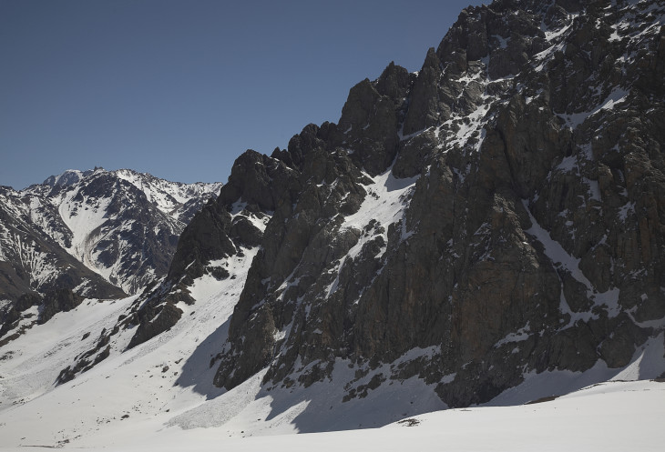 Мы поднялись до самой седловины, до высоты 3200. здесь уже начинает чувствоваться высота, и голова слегка чугунная, и смех уже достаточно глупый. Вокруг суровые горы Северного Тянь-Шаня, по всем соседним склонам лежат следы лавин, свежих и не очень.
