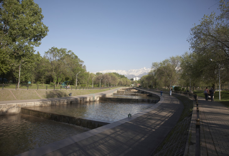 В первый вечер хватает просто прогулок по городу. Так получилось, что жили мы вроде и в центре, но именно в этой части я никогда не была. Так что прошли вдоль Алматинского канала, посмотрели на каскады грязной воды и на далекие белые горы над ним.