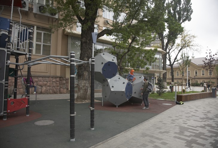 Но потом все-таки начался дождь и пришлось возвращаться обратно в город. В Алмате дождя еще нет, так что остаемся гулять по центру. Здесь, в прогулочной зоне на Жибек Жолы можно не только купить сувениры, но и отправить детей играть на площадке, а самим немного посидеть.