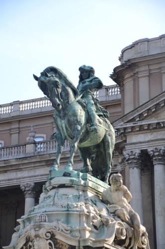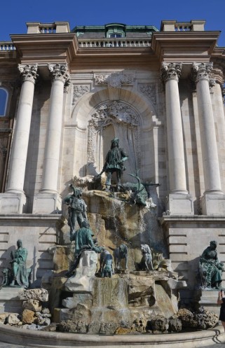 Перед самим дворцом стоит конная статуя Евгения Савойского – австрийского полководца, возглавившего битву с войском Османской империи под Веной. (Памятник Евгению Савойскому у Королевского дворца Будапешта )