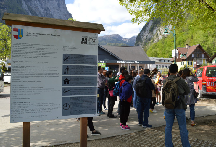 Узенькая дорожка петляет, с каждым поворотом все больше и больше открывая заснеженные верхушки гор. Появляются тоннели, пробитые в скалах. Отдельно стоящие виллы и гостиницы. Последний тоннель, шириной в одну полосу и вы въезжаем в Гальштат. Заехав в городок, утыкаемся в знаки «остановка запрещена», велком на платные парковки, коих несколько штук. Шлагбаум с карточкой на въезде, стенда с ценой нет. Ну да ладно, пару часов нам хватит на осмотр, много не натикает.