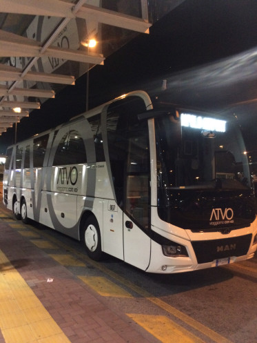 До автостанции Тибуртина от отеля добирались на метро. Выезд с автостанции по расписанию. Билеты покупали заранее, онлайн. При посадке контролер просканировал штрих-код билета, который я распечатал. Автобус очень комфортный, двухэтажный, с кондиционером, туалетом. На дороге была стабильная скорость 100 км\ч.