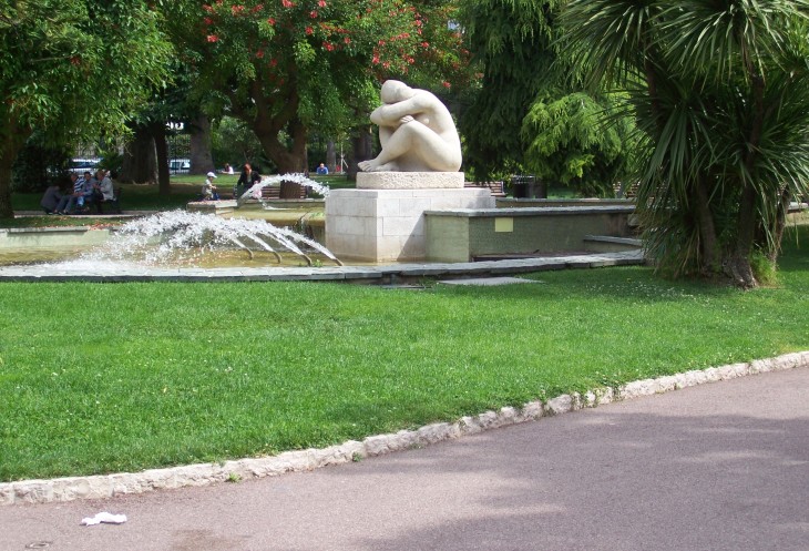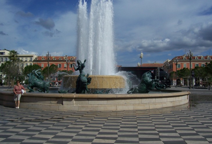в 1956 году античные аллегорические бронзовые фигуры Земля, Марс, Меркурий, Сатурн и Венера оседлавшие коней или укрощающие быков украсили чашу фонтана. Центральной фигурой фонтана является семиметровая мраморная статуя Аполлона скульптора Альфреда Жанио. Видите в самом центре? По этическим соображениям голый мужик в 1979 году из центра Ниццы удалился, а вернулся только в 2011 году.