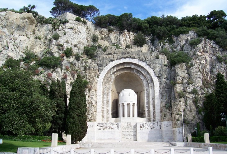 От сада Альберта на восток у подножия Замкового (или Римского) холма Colline du Château) на Рауба-Капу (Quai Rauba-Capeu) Монумент Погибшим в первой мировой.