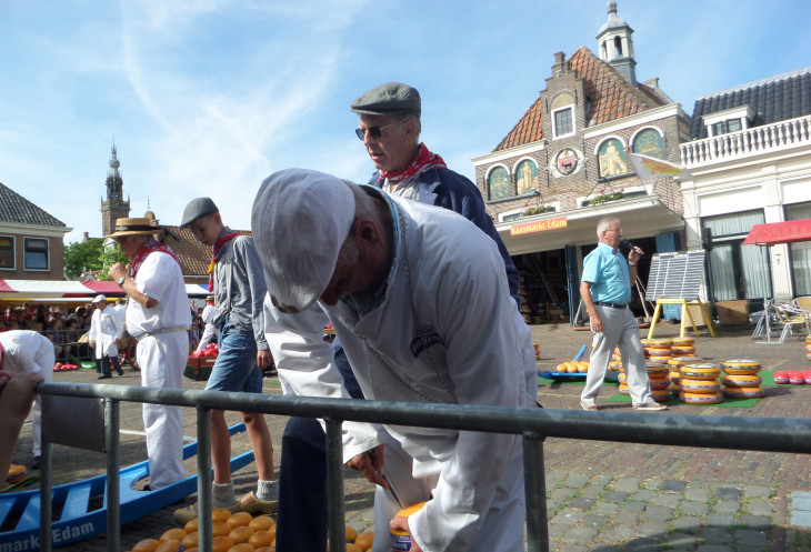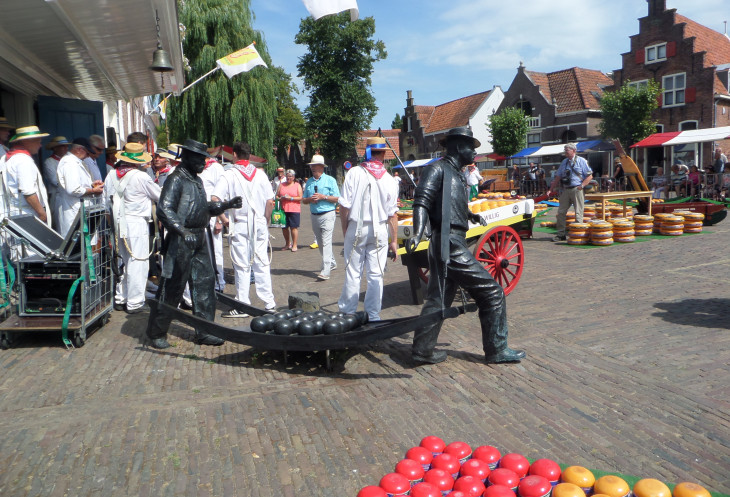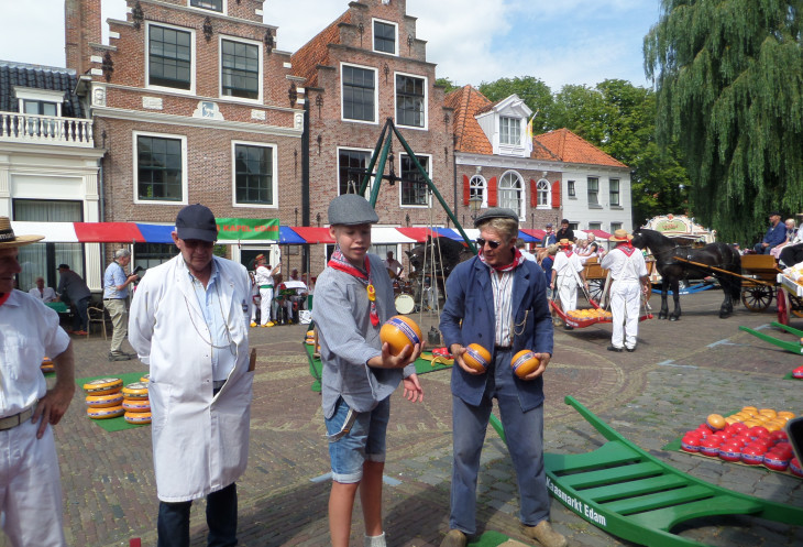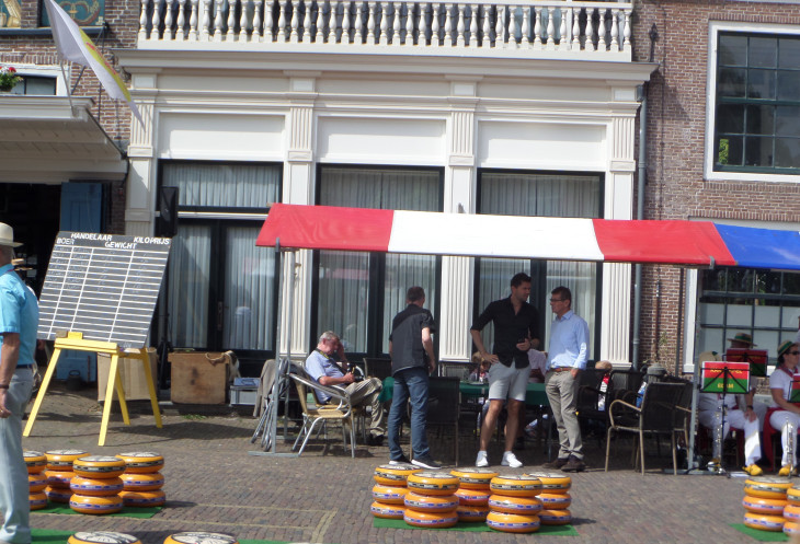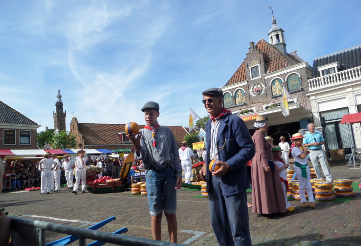 Здесь с XVI века проводится Сырный рынок. На это город получил право от Вильгельма Оранского. По периметру площади стоят лавки для зрителей. Почти все они были уже заняты, но я нашла удачное местечко. На земле на ковриках лежал сыр - шары красного и желтого цвета, и огромные плоские круги.