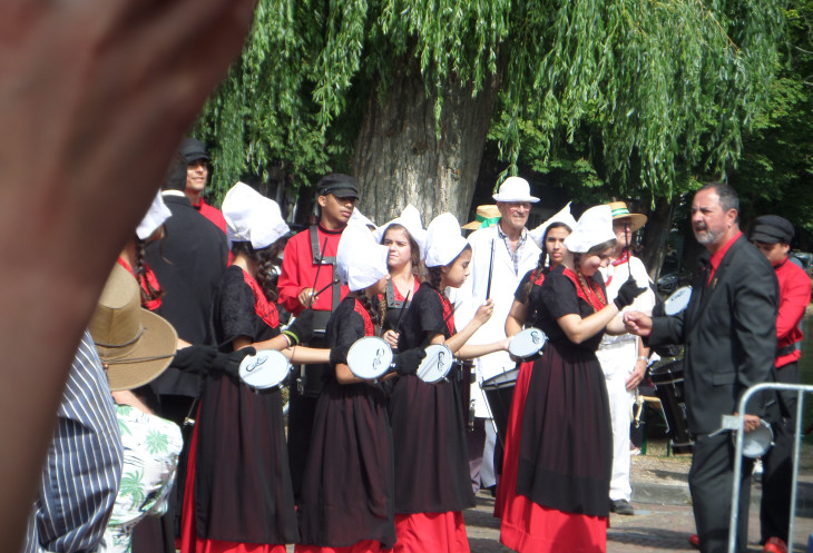 И вот сзади послышались новые звуки музыки. Это шёл ещё один оркестр. Музыканты были юны, в красно-чёрных одеждах. Несли они огромные чёрные барабаны и гигантские чёрные тарелки. Как потом выяснилось, это были гости из Бразилии.