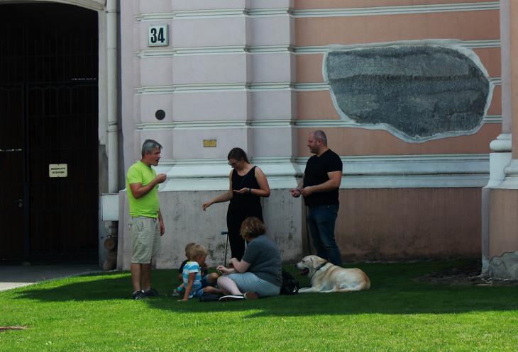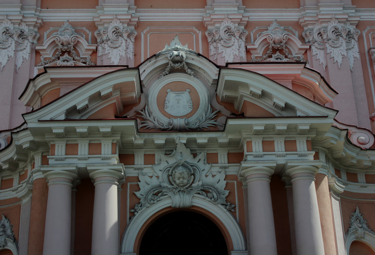 …И вот шли мы, шли… совсем недолго, даже не успели заскучать, как вдруг! – ну ничего себе! – всё такое розовое барокко, с крестами, под короной (великокняжеской митрой) практически! понятное дело, мы пошли туда! Какое-то семейство расположилось на газоне у стен, у семейства был просто восхитительный пёс! (Собак вообще очень много в Вильнюсе, разных, роскошных – люблю их, да)
