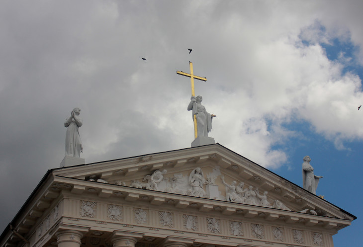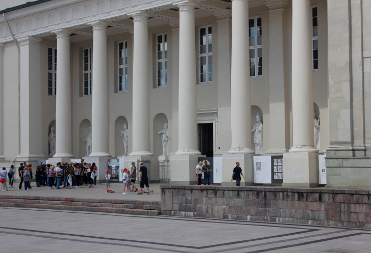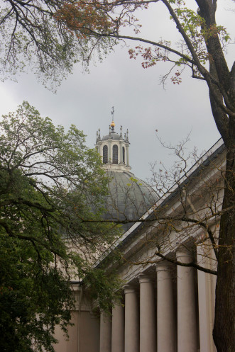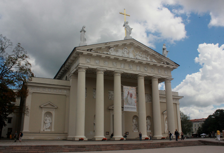 Осмотрев поближе памятник, мы, минуя башню-колокольню, ринулись в Кафедральный собор – римско-католический собор Свято́го Станисла́ва и Свято́го Владисла́ва, с почетным статусом малой базилики, присвоенной ему Папой – типичный образчик архитектуры в стиле классицизма. Изначально был сооружён на месте языческого святилища. Как гласят открытые источники, с крещением Литвы в 1387 году Ягайло (внук Гедимина, король польский и великий князь литовский), прибыл в Вильну, разрушил языческий храм и заложил на его остатках христианский храм Святого Станислава. Храм, понятное дело, многажды горел… В XVI в. его даже итальянцы восстанавливали, отчего он приобрел черты итальянского ренессанса, но потом снова горел… В юго-восточном углу храма в 1623-1636 годах была пристроена капелла свеже канонизированного Св. Казимира (княжича литовского и королевича польского, не абы кого).
