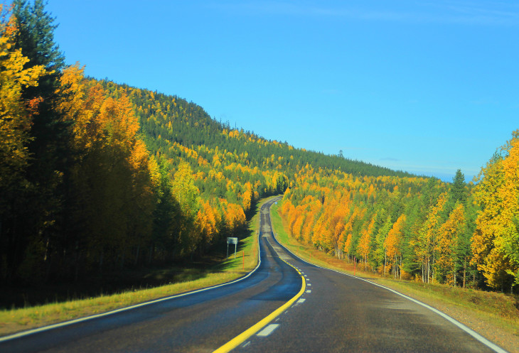 С утра нас ждала неожиданно хорошая погода! Радостно мчимся по еще пустому шоссе, окруженному ярко освещенными оранжево-желтыми деревьями.