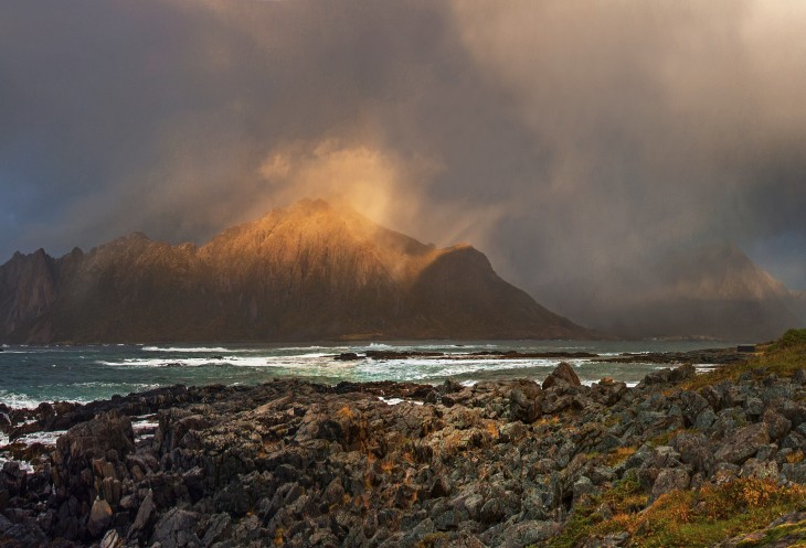 Пока снимаем это великолепие, налетает темная грозовая туча. По счастью она нас задела только краем, но зато на противоположном берегу, разразилась серьезным ливнем, а когда сквозь какую-то дыру на склон закрываемой ею горы пробился яркий солнечный луч, на несколько минут началась настоящая вакханалия света!
