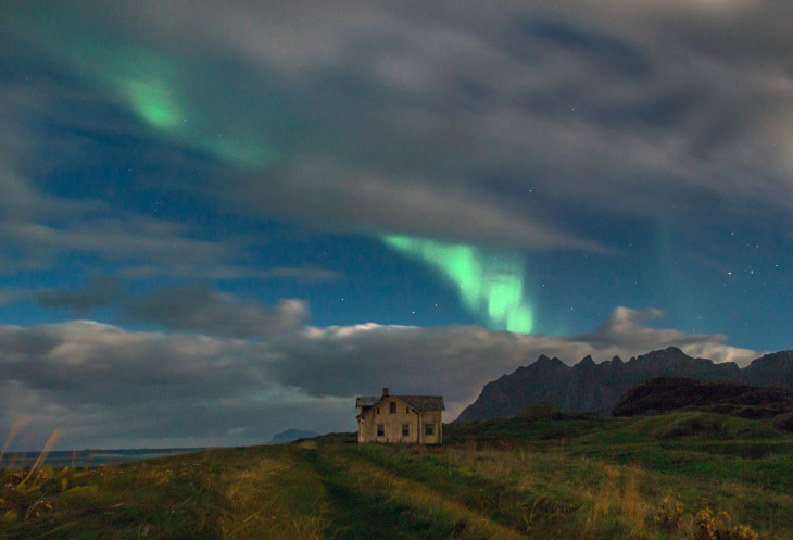 Уже поздно вечером после ужина с обязательным «Ну, за приезд!» и вечерним хоровым пением, выйдя на улицу, видим в разрывах облаков полоску Северного Сияния, которое, правда, быстро прячется от нас за низкими облаками. Успеваю сделать всего пару снимков.