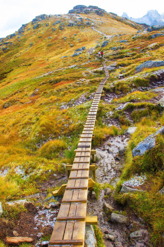 Cнова небольшой крутой подъем, но по хорошо натоптанной тропе идти не сложно, хоть и цепляемся иногда за камни руками. Дальше относительно ровный участок, меcтами немного заболоченный, и тут, к нашей радости, для туристов проложены деревянные мостки, дабы ноги не промочили, те, кто без сапог сюда забредет!