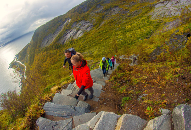 Даже представить боюсь, сколько это строительство могло стоить. И для чего это нужно? Понятно, если бы с туристов деньги за подъем по ней собирали, так ведь нет! Видимо, просто для того, чтобы больше туристов приезжали сюда и понимались на гору, чтобы полюбоваться открывающимися оттуда совершенно сказочными видами. Вот что значит развитие туризма по-норвежски! Снимаю шляпу!
