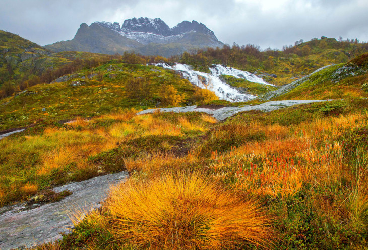 Двигаемся к широкому водопаду, который образует речушка, вытекающая из «нашего» озера. По пути вдоль тропинки растет множество кустов травы ярко оранжевого цвета, что придает красоту окружающей природе, несмотря на опять помрачневшую погоду.