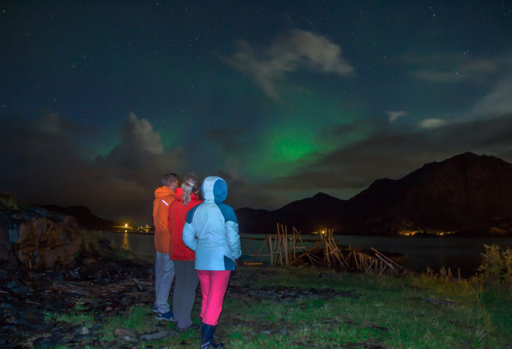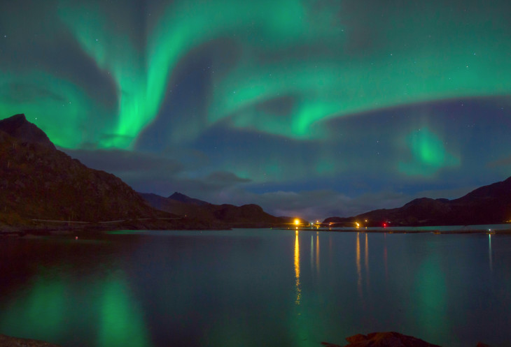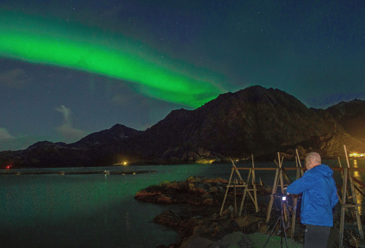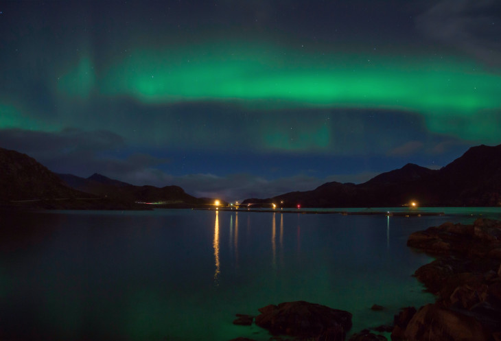 Для фотсъемки сияния здесь очень хорошие условия: ветра нет, не холодно, от нашего домика нужно отойти всего на 30-40 метров до широкой водной глади фьорда, в которой отражается еще пока слабый зеленоватый свет авроры.