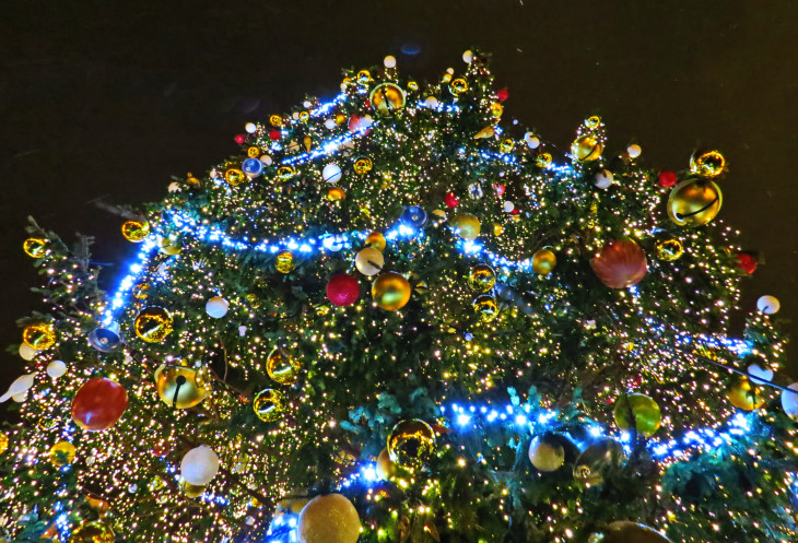 В центре площади огромная елка, которая в определенный момент начинает играть всеми огнями под музыку, поэтому её называют «поющая елка».