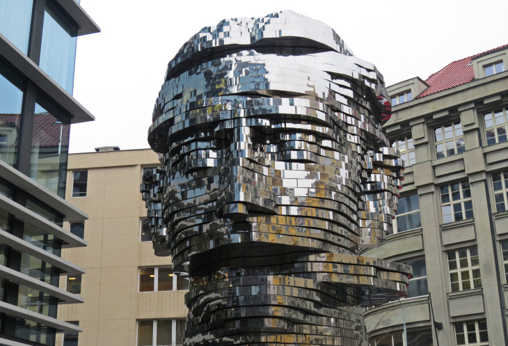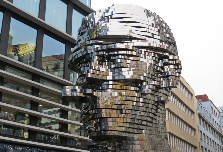 Франц Кафка родился в Праге, и здесь же и похоронен, на Новом еврейском кладбище в районе Жижков. Столь известного соотечественника не забыли в Чехии. Решили увековечить своего земляка. В Праге любят нестандартные решения и решили, что это должно быть что-то динамичное, постоянно функционирующее. Для создания памятника пригласили Давида Черного, который всегда выделялся склонностью к эпатажу и богатой фантазией. (в Праге множество его скульптур). Он представил на рассмотрение заказчиков несколько вариантов, и выбор пал на оригинальную конструкцию, изображающую вращающую голову Франца Кафки. Скульптура Франца Кафки