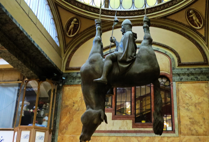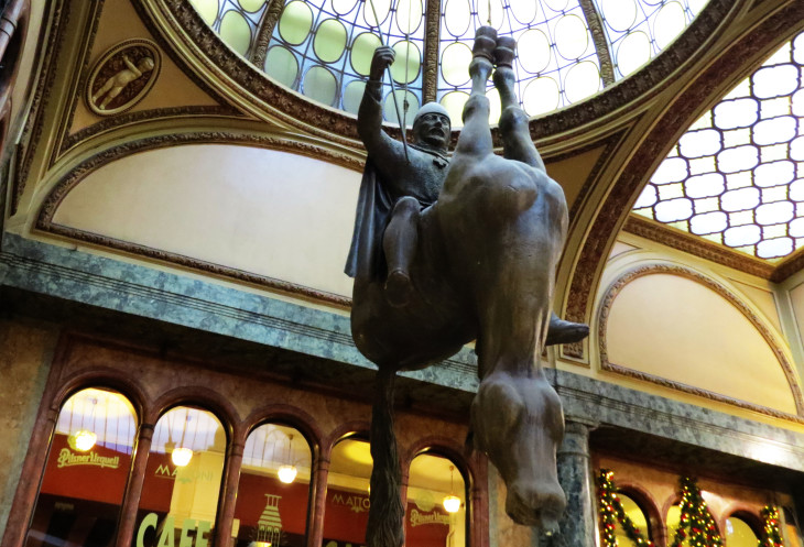 В 1999 году Давид Черный создал ещё одно свое знаменитое произведение «перевернутый Конь (Kůň)», изображающее св. Вацлава, восседающего на пузе своего мертвого коня. Памятник Вацлаву на перевернутой лошади Высота этого произведения 470 см, а его длина 290 см. Этот конь висит в пассаже Люцерна (Lucerna), Пассаж Люцерна в Праге как раз напротив нашего отеля. (слав Богу, мы уже рядом с домом).