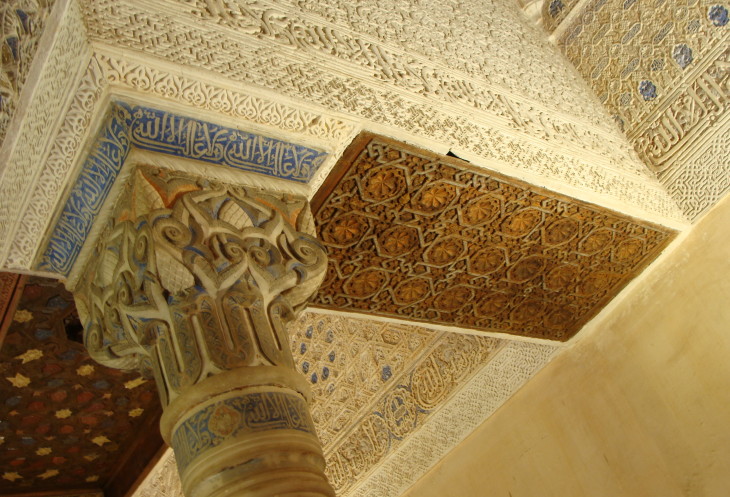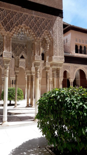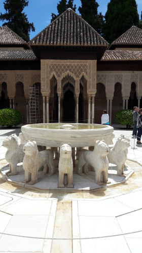Львиный дворик. Центральный двор дворца, по периметру окруженный арочными галереями. Входы в апартаменты выделены выступающими портиками. Окружающие дома покрыты остроконечными черепичными крышами. Посредине дворика расположен Фонтан львов, изображающий 12 стилизованных львов, держащих на спинах двенадцатигранную чашу. Чаша украшена стихами арабского поэта Ибн Замрака.