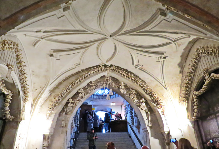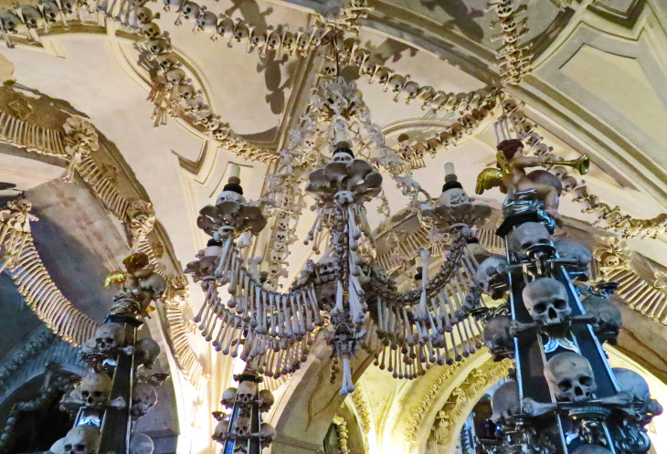 Интерьер костёла полностью отделан отбеленными хлоркой человеческими черепами и костями 40000 человеческих скелетов. Все детали внутреннего убранства оформлены костями,