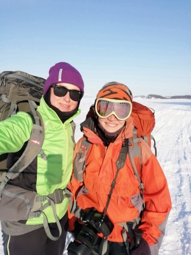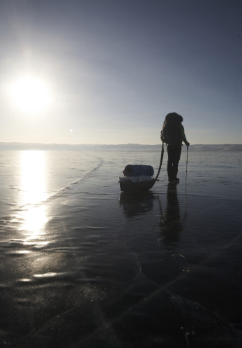 На берегу быстренько перегружаем основные вещи из рюкзаков в волокуши, на глазах у удивленных зрителей тащим волокуши по песку и, наконец, выходим на лед. Здесь он еще не очень прозрачный, не очень чистый и сильно исцарапан шипами автомобилей. Но очень скоро мы выходим на самый большой в мире каток: бескрайние пространства гладкого льда.