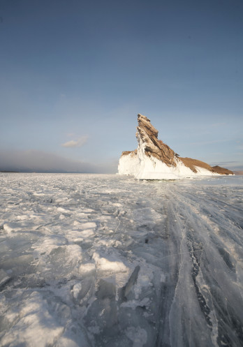 Первый же берег, который мы увидели в Малом море - берег острова Ольхон, полностью залит льдом. Осенью волны разбиваются об эти скалы, а потом замерзают гигантскими сосульками. Кое-где эти сосульки достигают высоты 3-4 этажа.