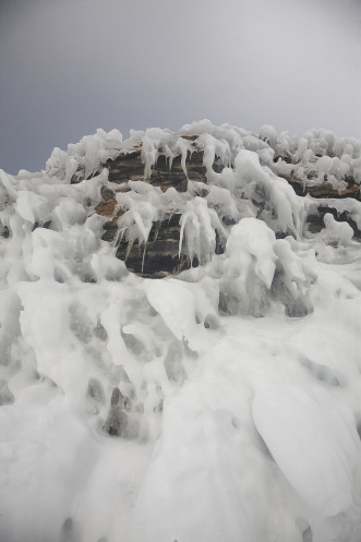 С подветренной стороны, где осенние волны были особенно сильные, лед покрывает все: скалы, склоны, деревья. Вот интересно, эти деревья потом оживут весной?