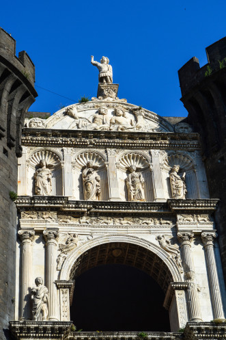 Возле ворот шла экскурсия, Мы тоже немного постояли, посмотрели и двинулись дальше на площадь Плебишито. Это самая большая площадь в Неаполе и считается самой красивой. Но сейчас здание церкви Святого Франциско обнесено лесами, вся площадь перегорожена, поэтому оценить ее красоту мы не смогли. Подобрались ко львам.)