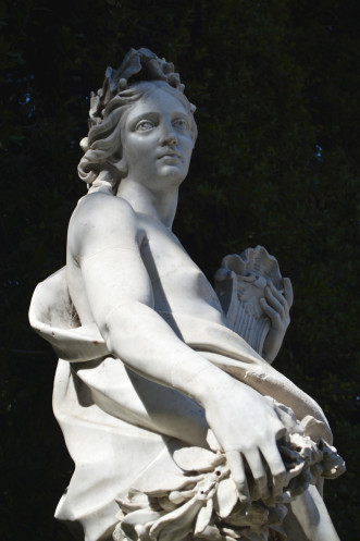 По балюстраде со скульптурами и вазонами спускаемся вниз, к фонтану.