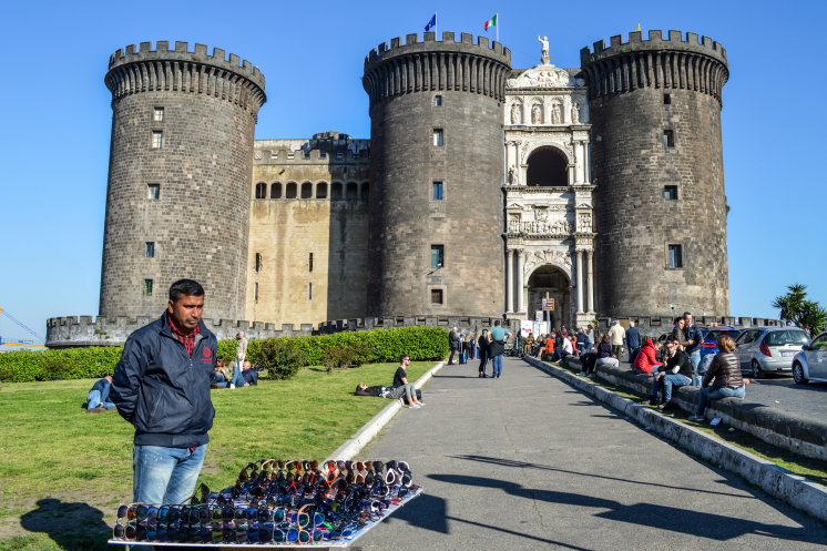 Вот и Кастель Нуово в лучах опускающегося солнышка. Сегодня воскресенье, крепость не работает. Но вокруг много народа, который просто гуляет и отдыхает. Вокруг замка какая то стройка, портящая вид. Торговцы всякой мелочью тоже здесь в ожидании своих покупателей.