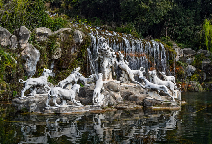 а вторая скульптурная группа изображает как Актеон превращается в оленя под удивленными взглядами собак, которые уже готовы разорвать жертву.